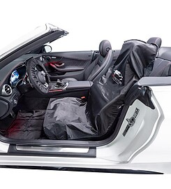 - 1 protège-siège Premium, nylon, avec couture noire sur le bord et boucle de suspension ainsi qu'impression "PROTECTOR" en rouge et blanc